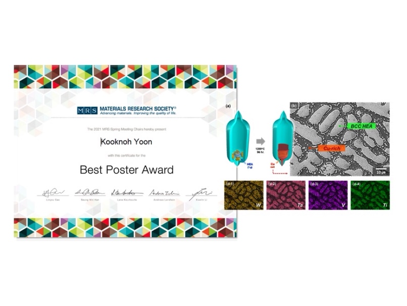 재료공학부 박은수 교수 연구팀 윤국노 연구원은 지난 4월 개최된 미국 재료 학회(MRS, Materials Research Society) 주최 2021 Virtual MRS Spring Meeting & Exhibit에서 최우수 포스터 발표상(Best poster award)을 수상하였다. 세계적으로 재료공학 분야에서 가장 권위 있는 학회 중 하나인 MRS 정기학회는 매년 1500 편이 넘는 포스터 발표가 진행된다. 본 학회에서 윤국노 연구원은 ‘Bi-Continuous Refractory HEA/Cu Composite with Superior Thermal Conductivity at High Temperature’ 라는 주제의 포스터 발표를 통해 기존에 보고되지 않았던 내열 하이엔트로피 합금과 Cu가 조합된 금속 복합 신소재를 개발하여, 초고온에서도 고강도와 고열전도도의 trade-off 관계를 성공적으로 극복함으로써, 미래의 에너지원인 핵융합로와 같은 극한환경 구동부에 필수적으로 요구되는 극초내열 방열 신소재 개발에 대한 새로운 통찰을 제공하여 수상의 영예를 안았다.