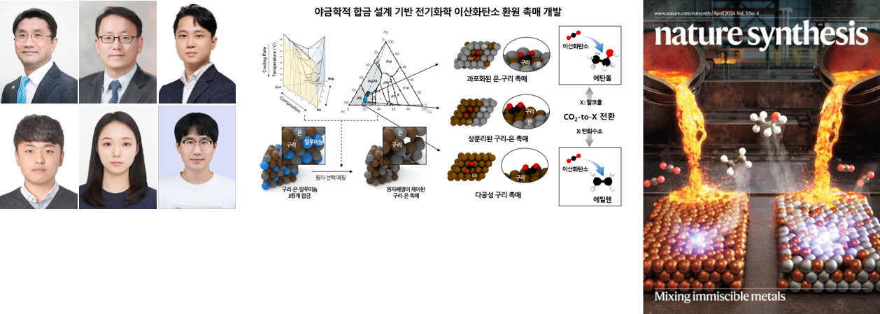 서울대학교 재료공학부 주영창, 박은수 교수와 DGIST 에너지공학과 남대현 교수 연구팀은 야금학 기반의 새로운 공정을 통해 이산화탄소를 에틸렌 또는 에탄올로 선택적으로 전환할 수 있는 전기화학 촉매를 개발했다. 기존에는 구리 기반 촉매의 전기화학적 이산화탄소 전환반응 산물로 에틸렌이 생산되는 것이 일반적이었으나, 구리 촉매에 원자배열을 제어하면서 은을 첨가함으로써 이산화탄소를 에탄올로 전환하는 데에 성공했다. 구리-은 합금은 열역학적 용해도 한계로 인해 원자배열의 제어가 어려웠으나 용융-급속 냉각 방식 및 선택적 식각 방식을 통해 이를 극복했다. 또한 이론적 계산과 반응 중 분석을 통해 반응 메커니즘 규명 및 이산화탄소 활용 기술의 상용화에 한 걸음 다가서게 되었다. 본 연구 결과는 소재합성분야 저명학술지인 ‘Nature Synthesis’에 게재되었으며, 연구의 우수성을 인정받아 Front cover로 선정되었다.