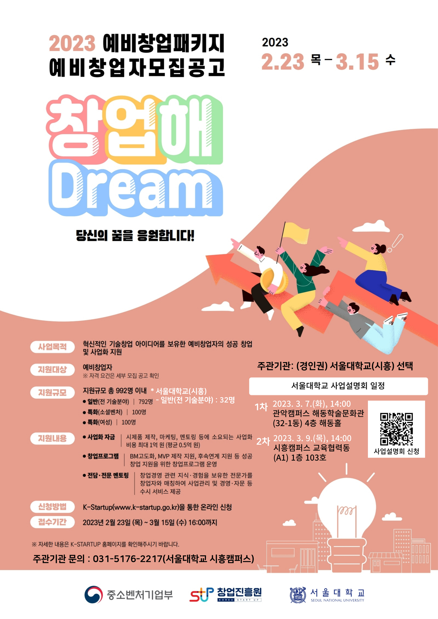 서울대학교 시흥캠퍼스에서 2023년 예비창업패키지 서울대학교(시흥) 예비창업자를 모집하오니 관심있는 학내 구성원은 신청기간 내에 신청 부탁드립니다.