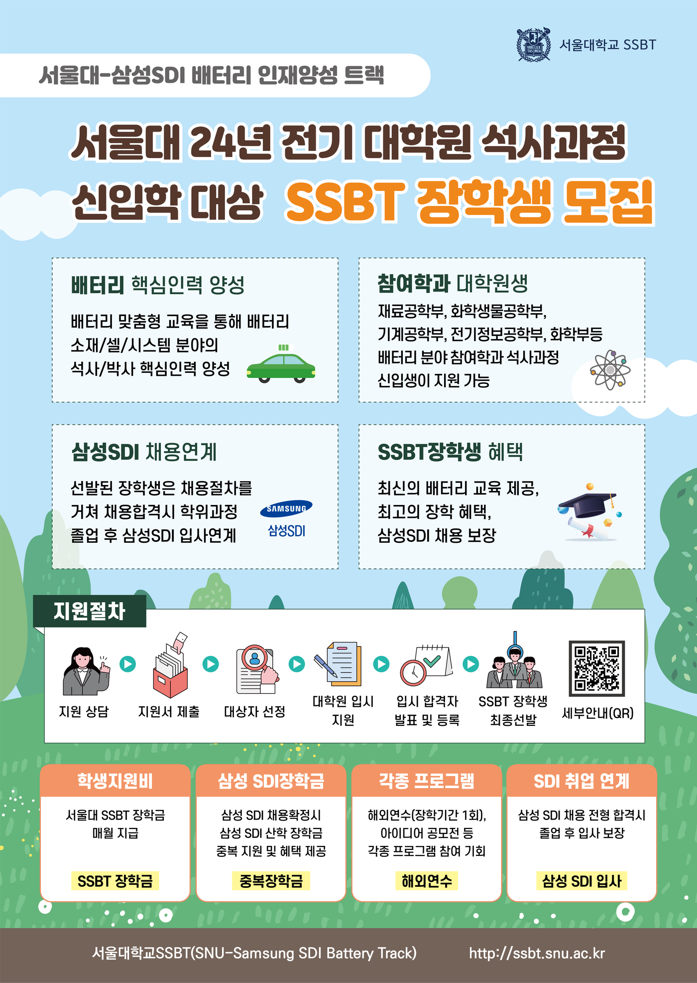 [서울대학교-삼성SDI 배터리 인재양성 트랙]24년 전기 신입학(석사) 대상 SSBT 장학생 모집