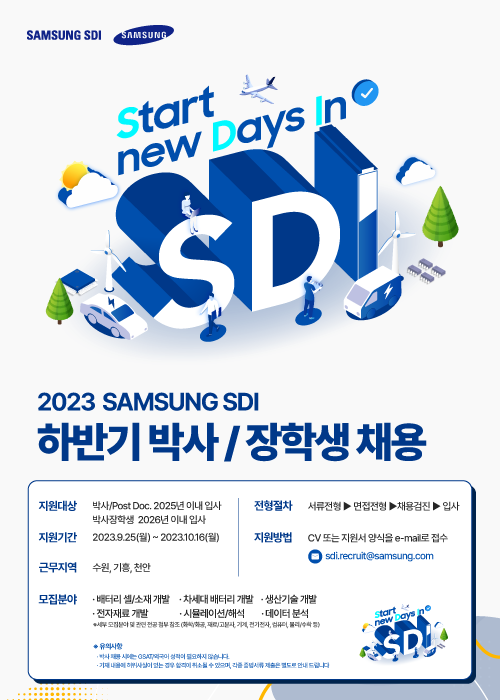 한국시간 기준으로 9월 25일(월)부터 삼성SDI 하반기 박사/장학생 채용 접수가 시작되어 안내드립니다.