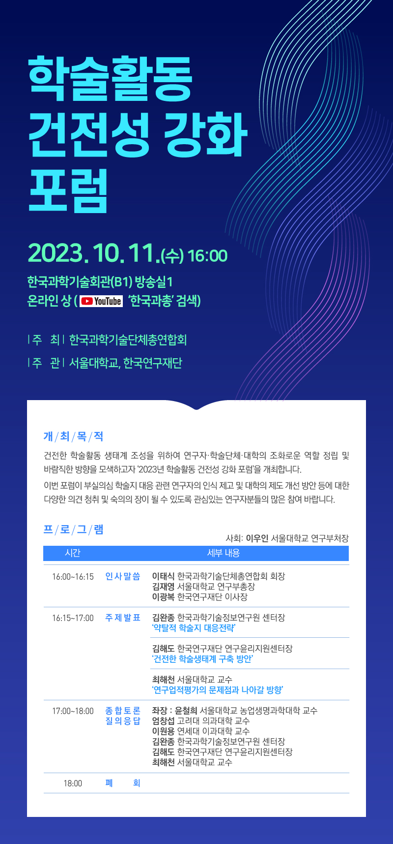 부실의심 학술지 대응, 학술단체 또는 연구자의 인식 제고, 대학제도 개선 등 학술활동 건전성 강화 방안 마련을 위한 포럼을 아래와 같이 개최하니,