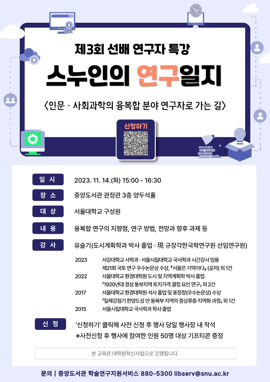 우리 도서관은 학내 구성원의 연구역량 강화 및 우수 연구자 양성에 기여하기 위하여, 대학원혁신사업의 일환으로 제3회 선배 연구자 특강 '스누인의 연구일지'를 다음과 같이 개최하고자 합니다.