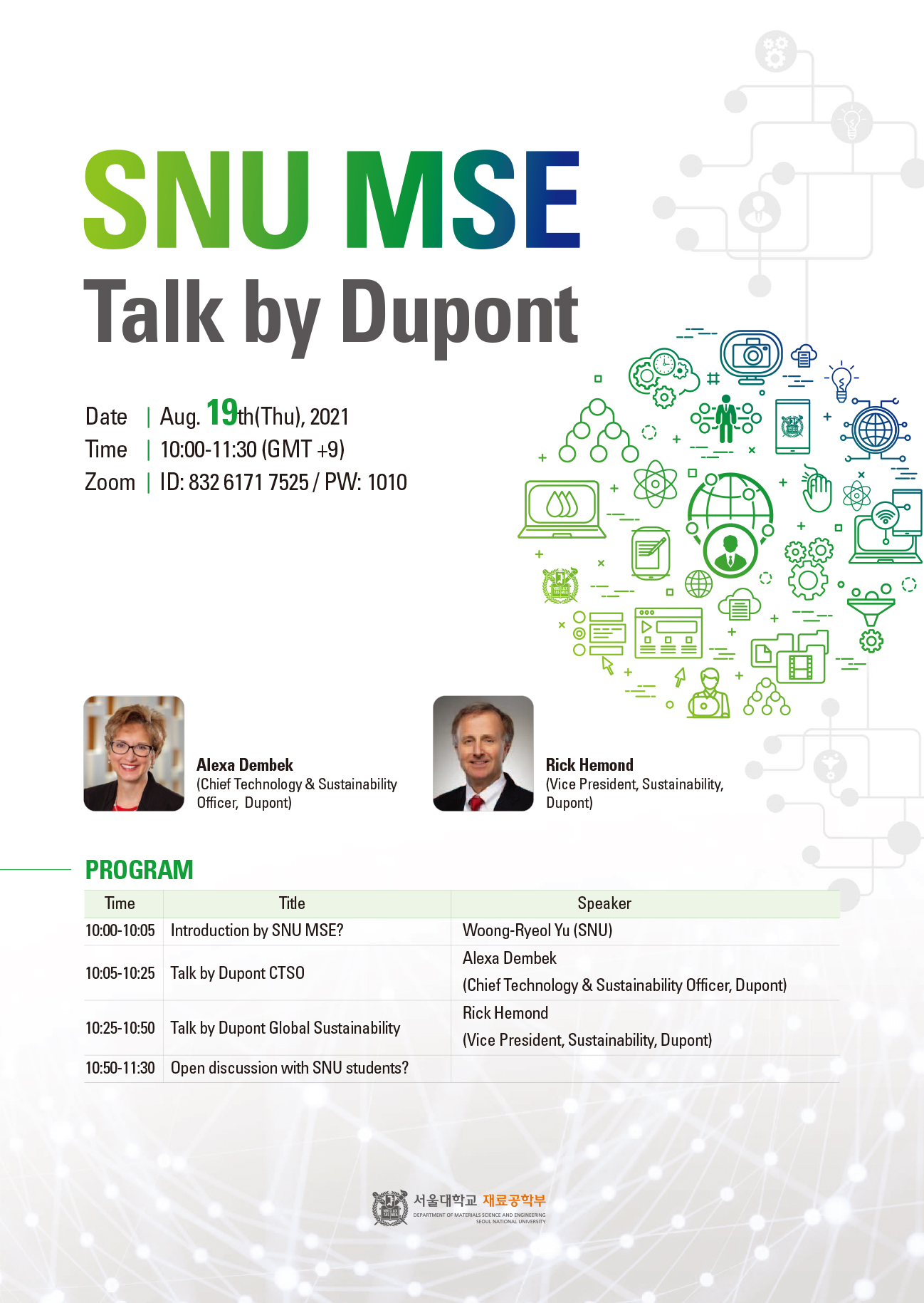 8월 19일 (목), 지난 5월 재료미래포럼에서 소개드렸던 Dupont Korea에 이어, Dupont CTOS와 Vice President, Sustainability 초청강연을 진행 할 예정으로