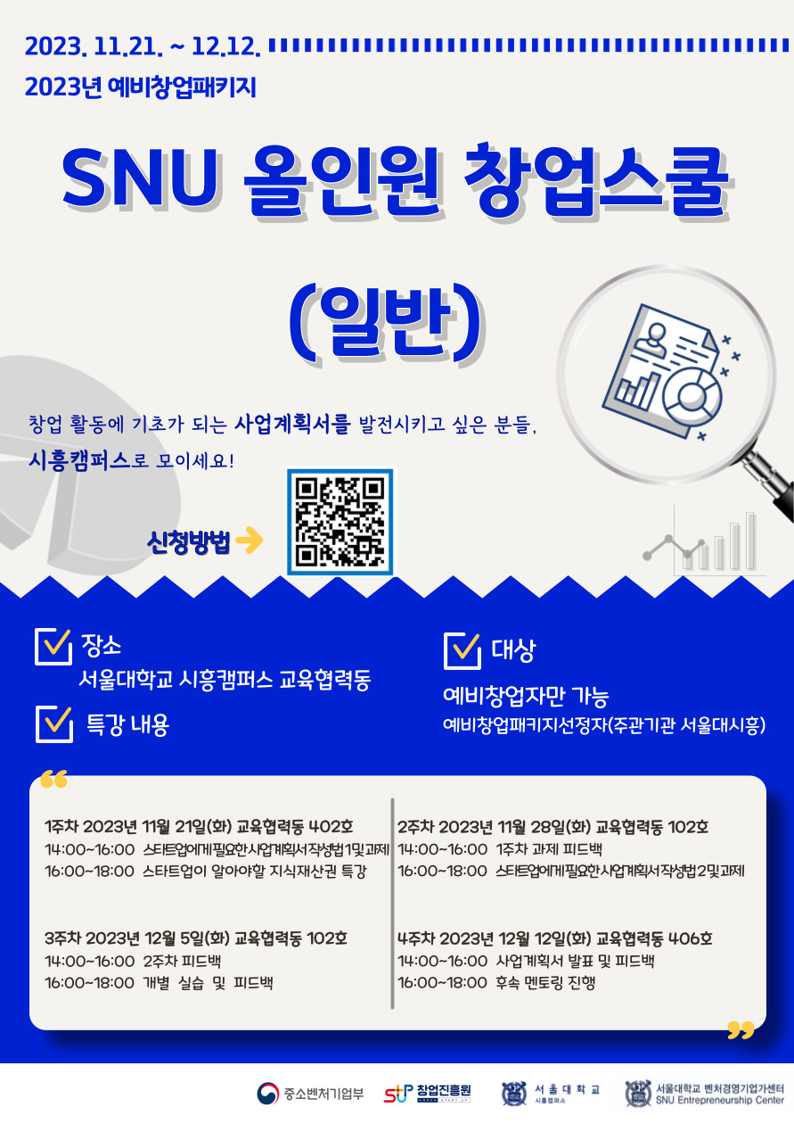 서울대학교 시흥캠퍼스에서 SNU 올인원 창업스쿨(일반) 특강 홍보를 위하여 붙임과 같이 자료를 송부하오니 관심 있는 학내 구성원의 참여 바랍니다.