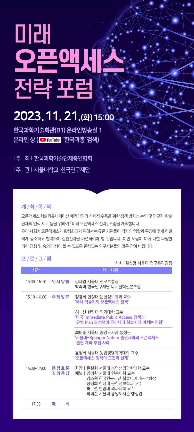 오픈액세스 학술커뮤니케이션 패러다임의 선제적 수용을 위한 정책 방향성 논의 및 연구자·학술단체의 인식 제고를 위한 「미래 오픈액세스 전략」 포럼을 아래와 같이 개최하니, 각 대학(원) 및 기관에서는 관심 있는 학내 구성원이 참여할 수 있도록 널리 홍보하여 주시기 바랍니다.