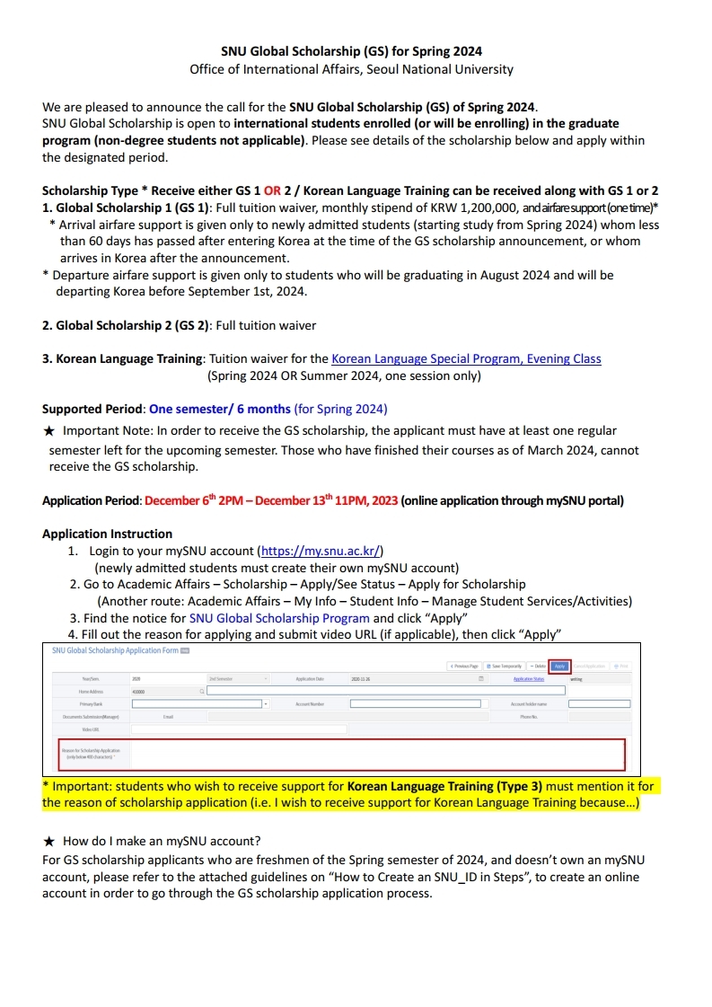 [장학] 2024학년도 1학기 글로벌 초우수 장학금(SNU Global Scholarship, GS) 신청 안내: ~ 12. 13.(수)까지