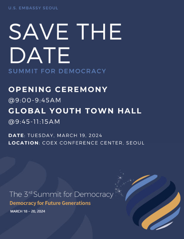 주한미국대사관은 한국 정부가 개최하는 ‘제3차 민주주의 정상회의’ 개막식과 글로벌 청년타운홀에 참가할 학생을 모집합니다.