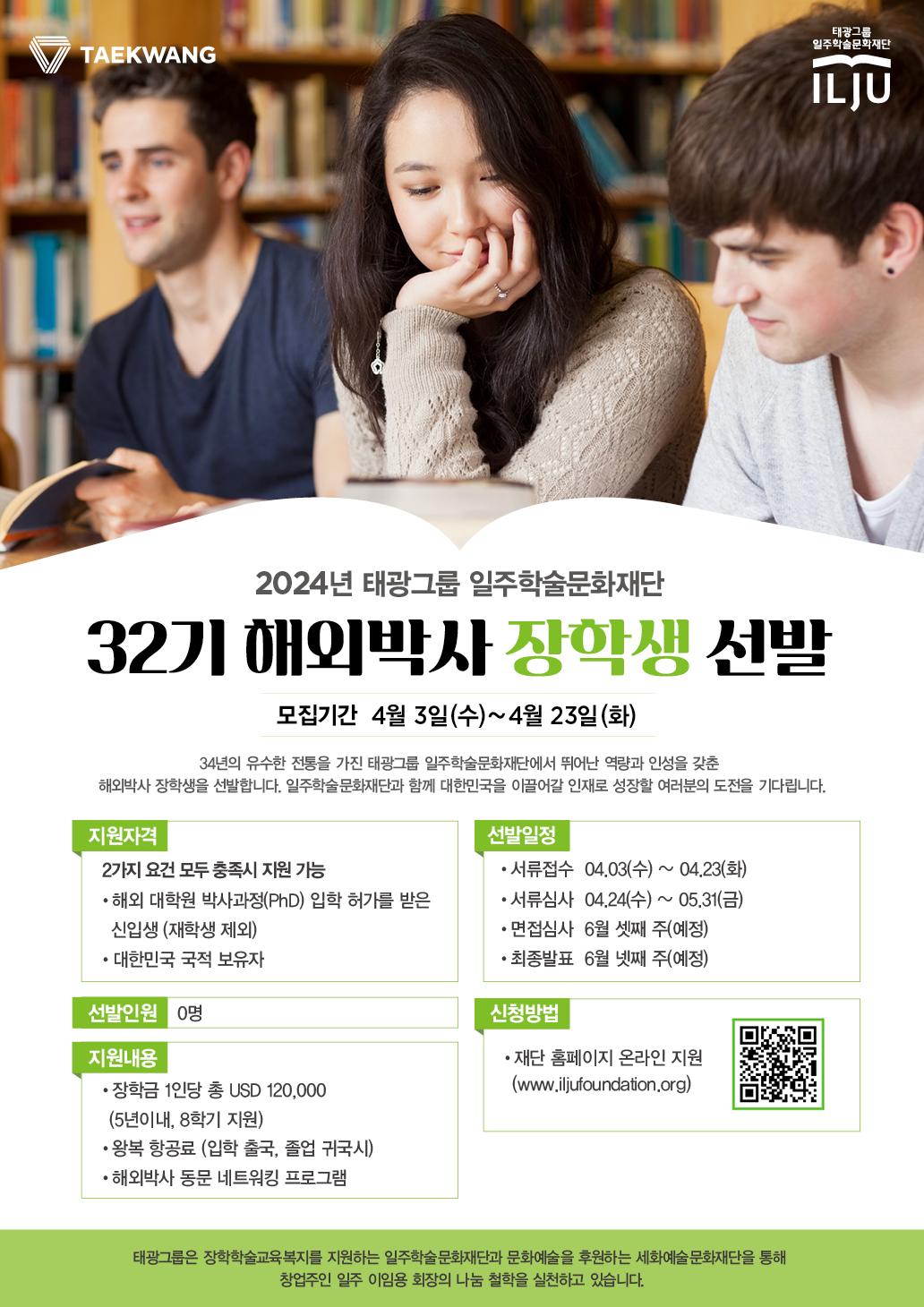 일주학술문화재단에서 2024학년도 해외박사 장학생을 아래와 같이 선발함을 알려드리니, 관심있는 학생들의 지원 바랍니다.
