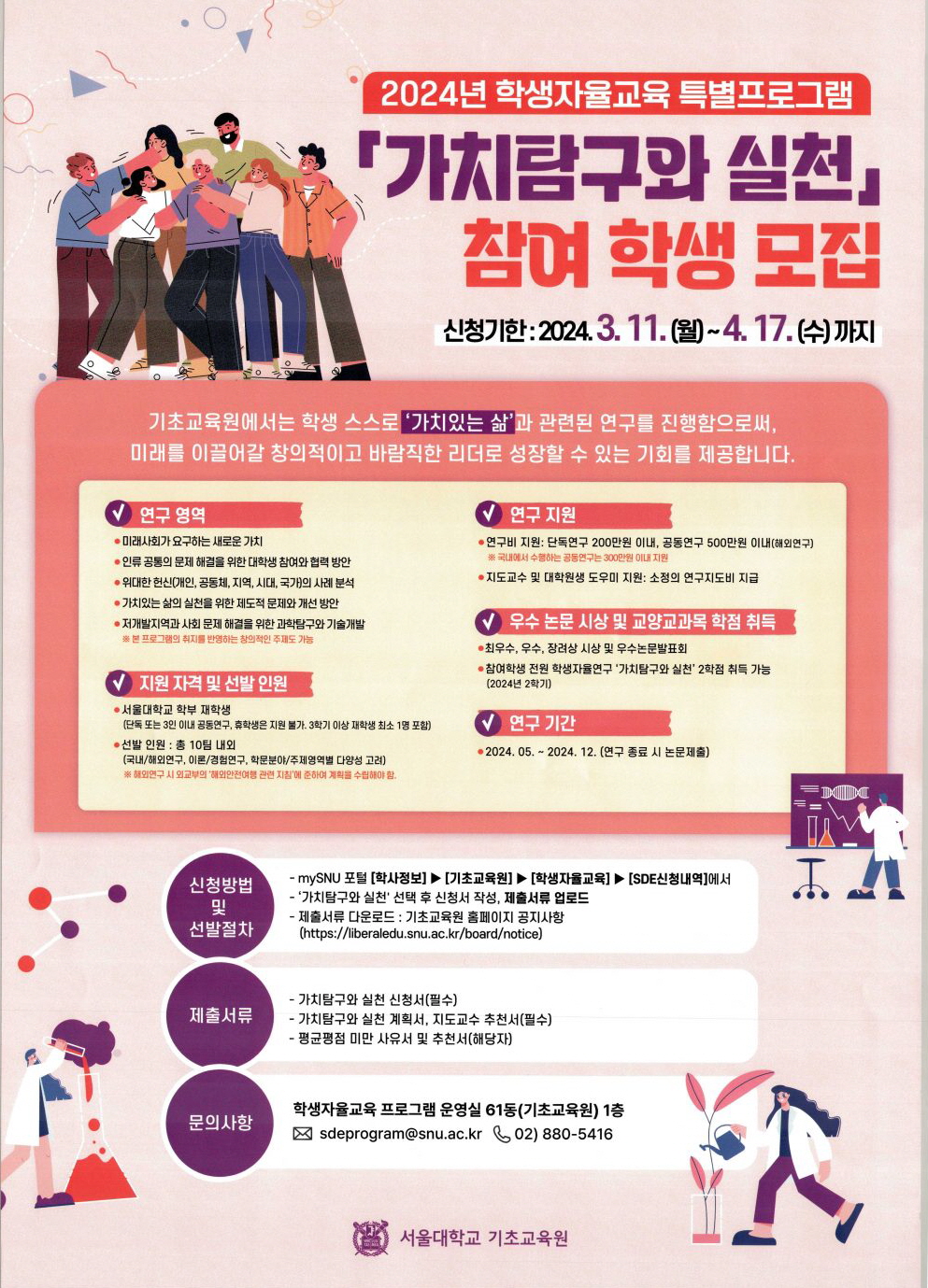 서울대학교 기초교육원에서 2024학년도 학생자율교육 특별프로그램, 『가치탐구와 실천』 참여 학생을 모집합니다.