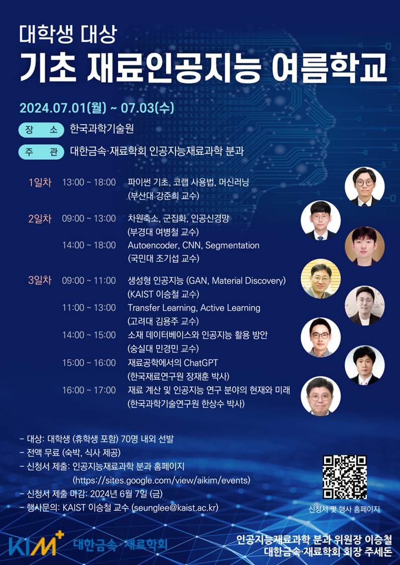 대한금속·재료학회에서 '2024년 기초 재료인공지능 여름학교'를 개최합니다. 인공지능재료과학 분과 주관으로 개최되는 이번 교육은 인공지능에 관심이 있는 재료공학 학부생을 대상으로 진행합니다.