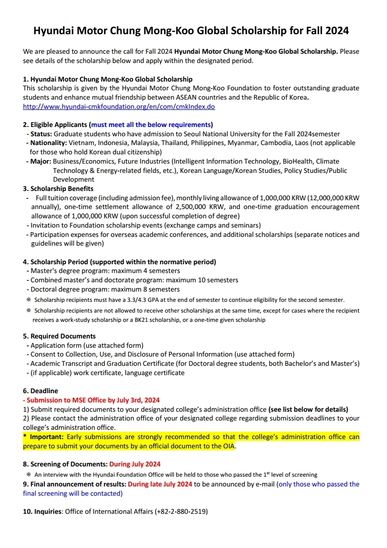 현대차 정몽구 글로벌 장학재단에서 2024학년도 2학기 외국인 장학생을 아래와 같이 모집하오니 관심있는 외국인 학생들의 지원 바랍니다.