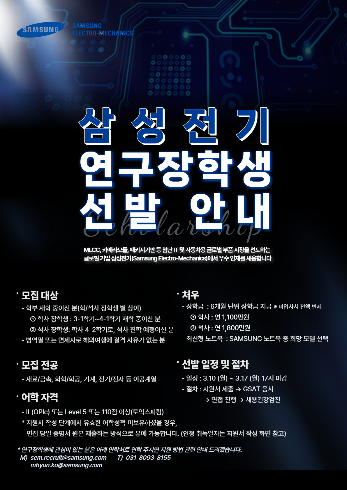 MLCC, 카메라모듈, 패키지기판 등 첨단 IT 및 자동차용 글로벌 부품 시장을 선도하는 삼성전기에서 글로벌 인재로 성장할 연구장학생을 모집합니다.