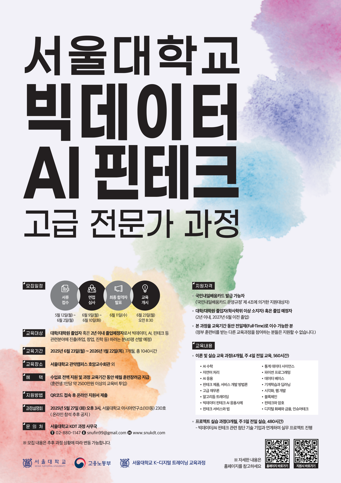 제 11기 서울대학교 빅데이터 핀테크 AI 고급 전문가 과정 모집 (~6/2(월), 설명회: 5/27(화), 15시)