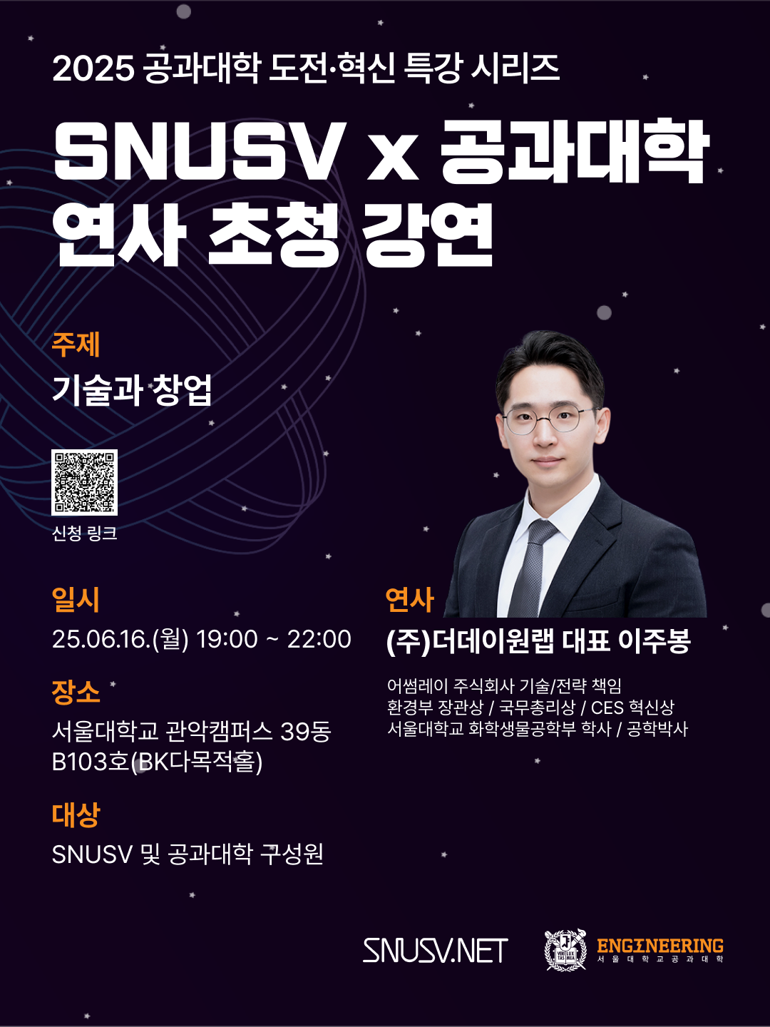 서울공대 구성원으로서의 도전·혁신 정신 함양을 지원하고자「2025 공과대학 도전·혁신 특강시리즈」를 개최합니다.