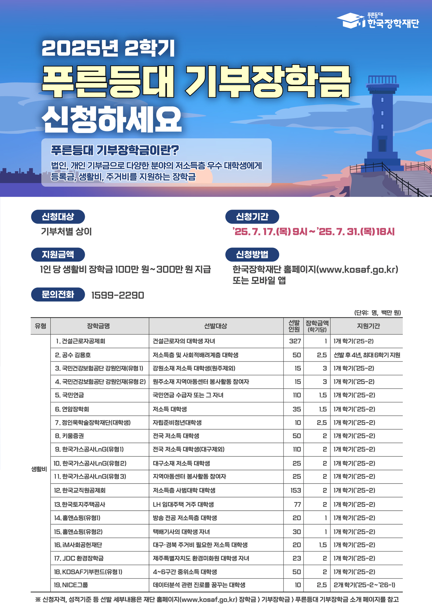 한국장학재단에서 2025학년도 2학기 푸른등대 기부장학사업 신규장학생을 아래와 같이 선발합니다.