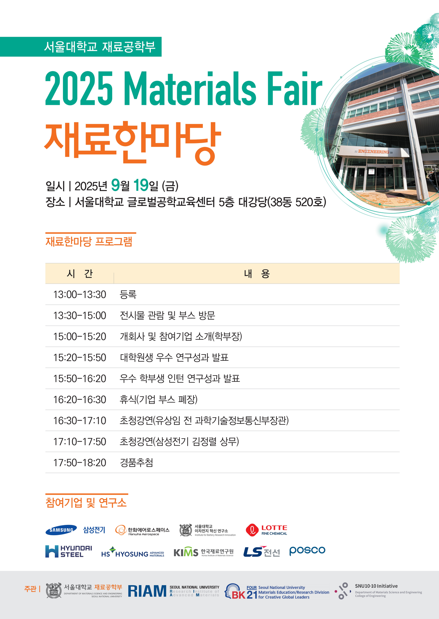 이번 행사는 9개의 기업 및 연구소가 후원하고, 재료공학부 39개 연구실과 18명의 학부 및 대학원생 연구자들이 참여하여