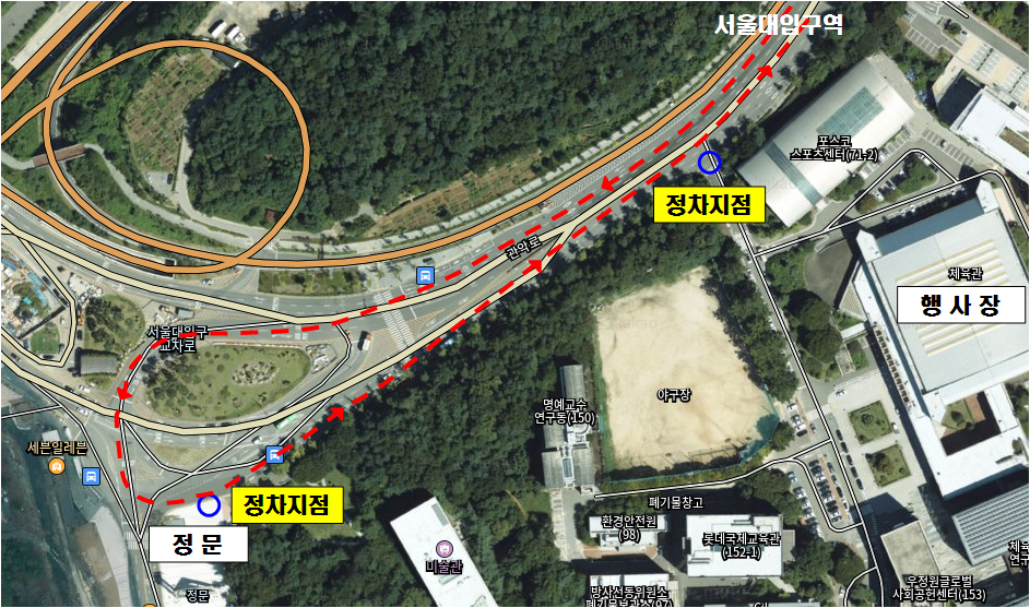1) 08:00 ~ 09:00 : 서울대입구역 ↔ 포스코스포츠센터 대로변 (행정관, 정문 정차)