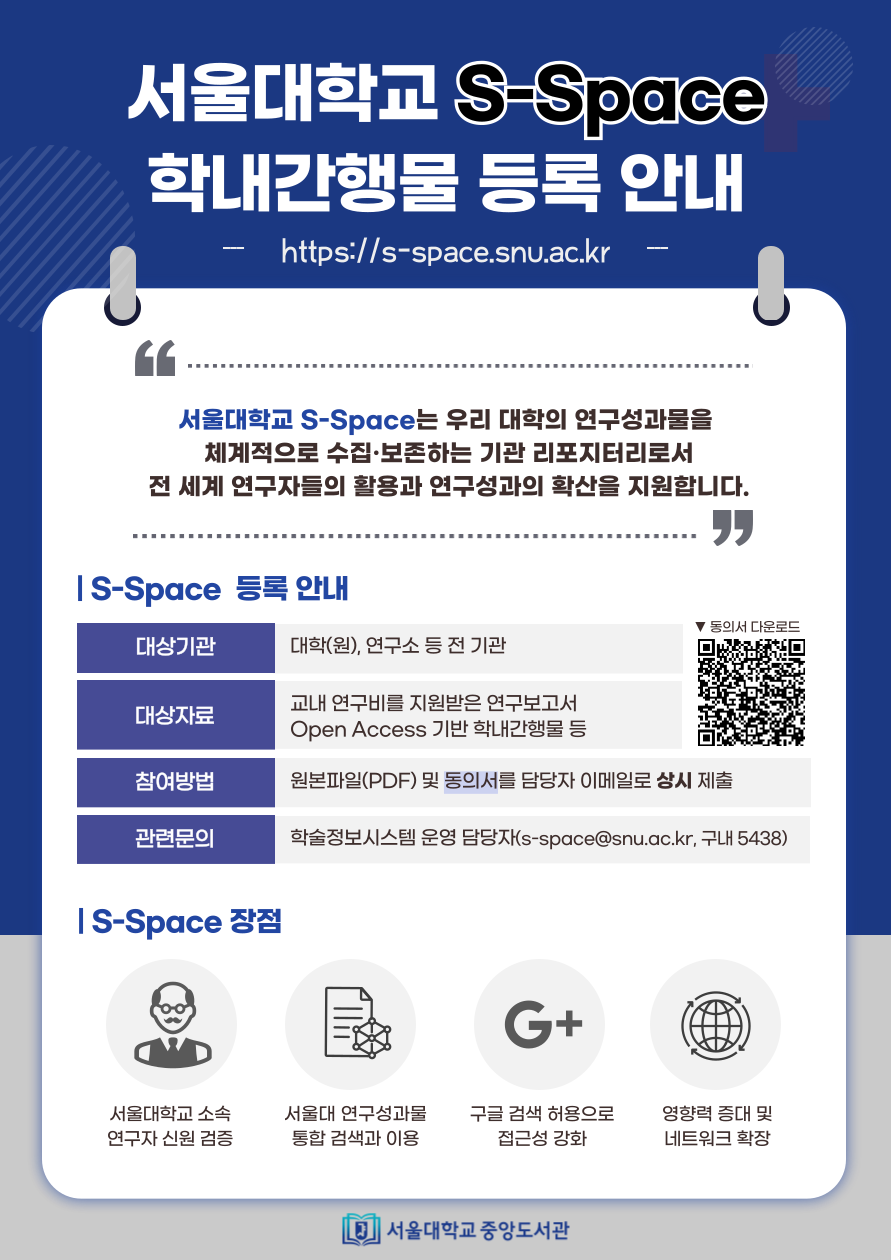 중앙도서관은 서울대학교 기관 리포지터리 S-Space를 통해 우리 대학의 연구성과물을 체계적으로 수집·관리함으로써 전 세계 연구자들의 활용과 연구성과의 확산을 지원하고 있습니다.