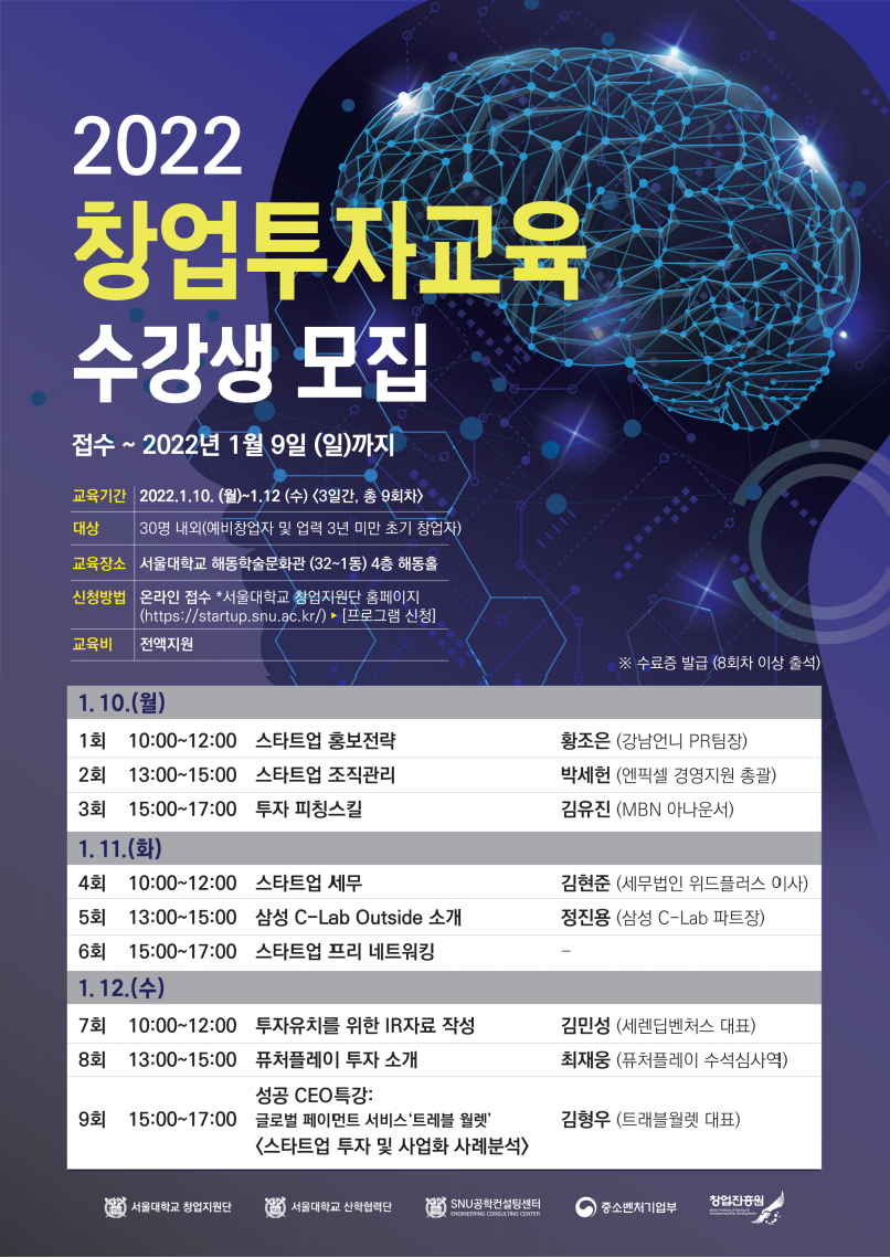 '2022년 창업투자교육' 수강생을 모집하오니, 관심있는 교내 학부생의 신청 바랍니다.