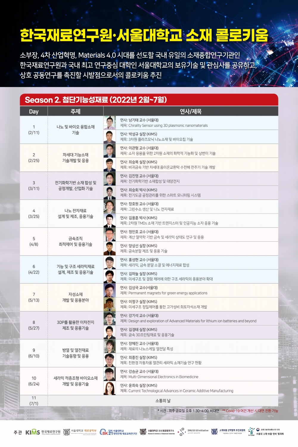 2022년에는 ‘Season 2: 첨단기능성재료 분야’ 프로그램이 2월 11일부터 격주 금요일 오후 1:30 ~ 4:00, 비대면 온라인으로 진행됩니다.