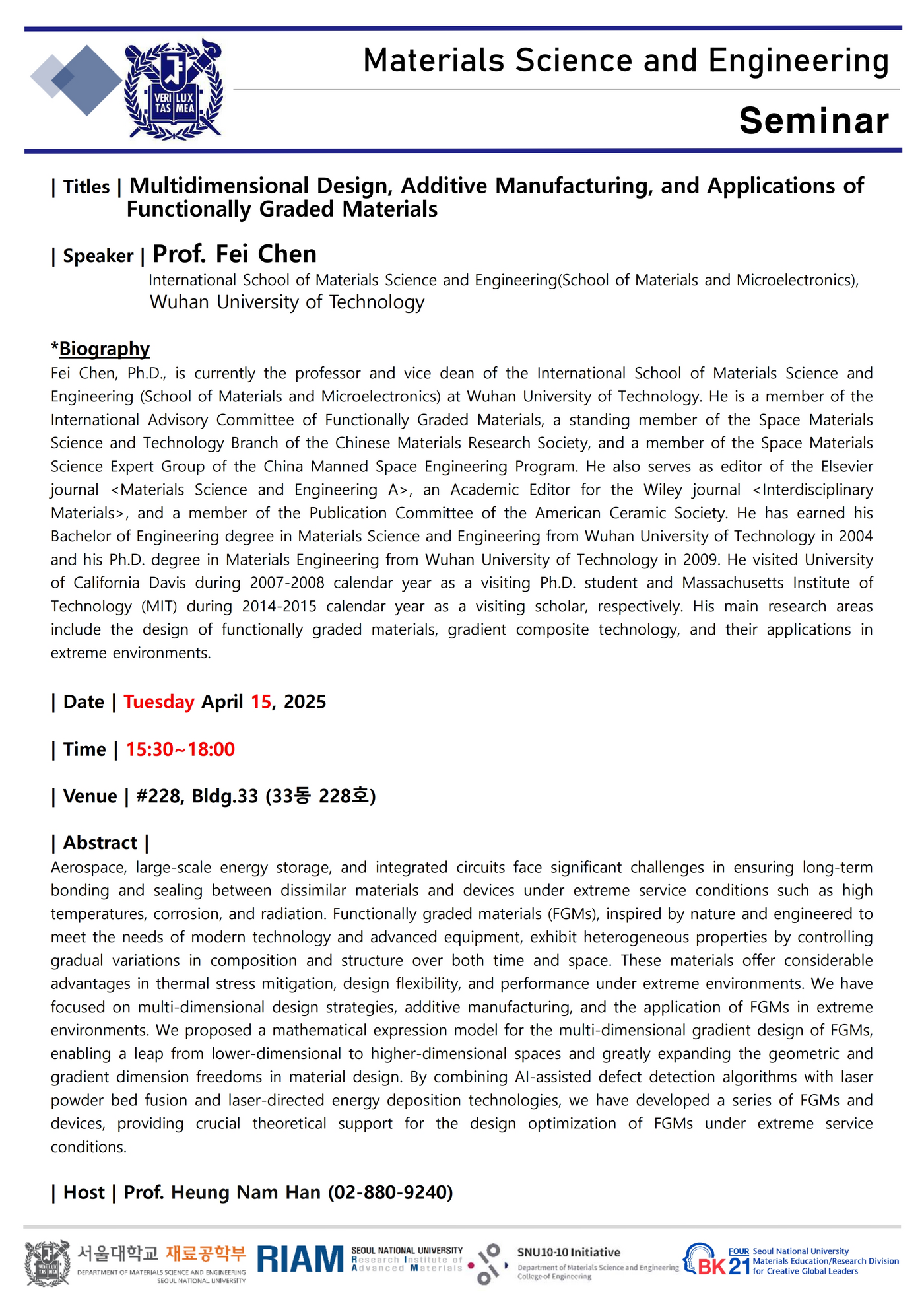 [세미나: 4월 15일(화), 오후 3시 30분] Prof. Fei Chen, Wuhan University of Technology (변경: 4/14(월) 오후 5시 → 4/15(화) 오후 3시 30분)