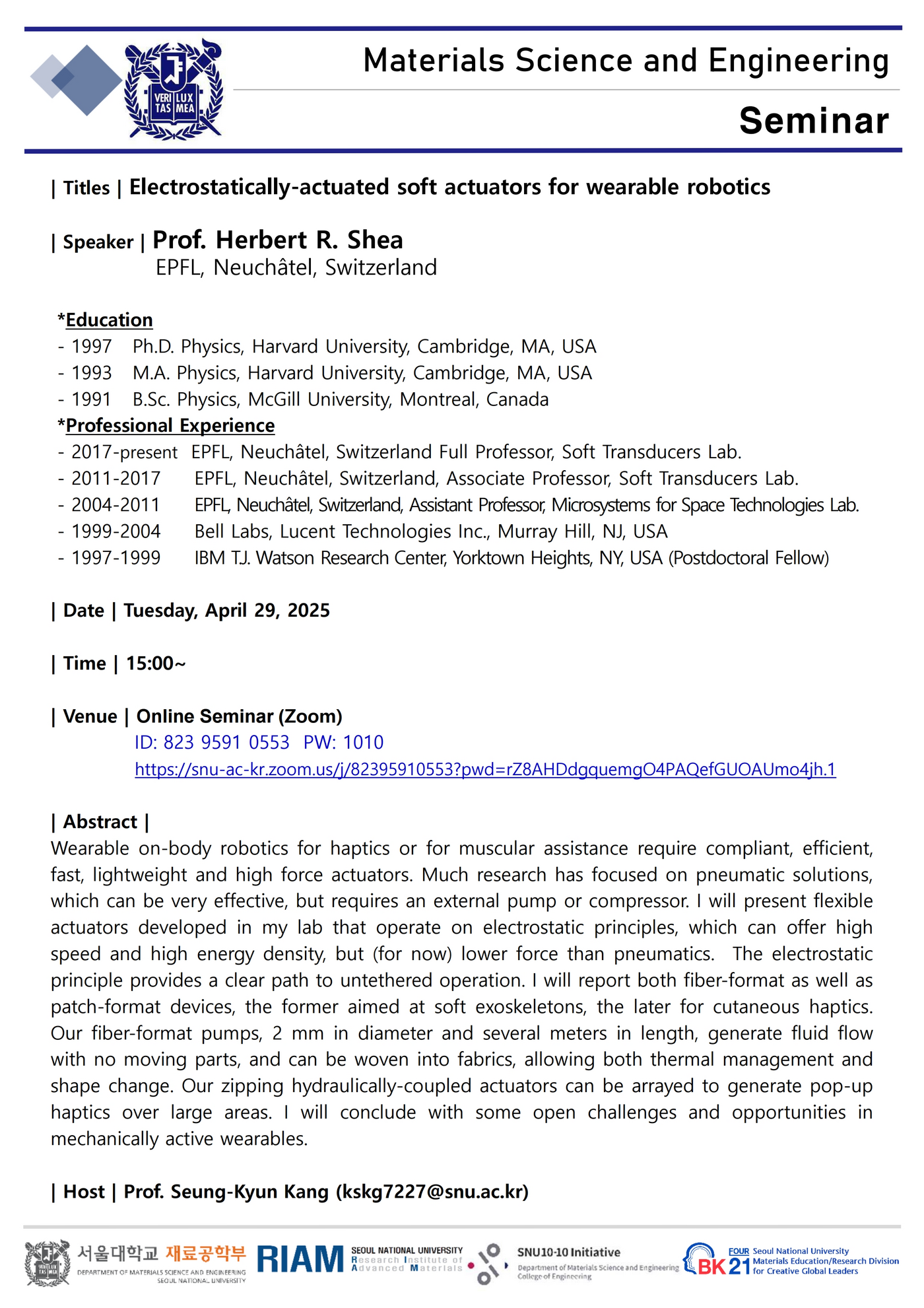 [세미나: 4월 29일(화), 오후 3시] Prof. Herbert R. Shea, EPFL, Neuchâtel, Switzerland