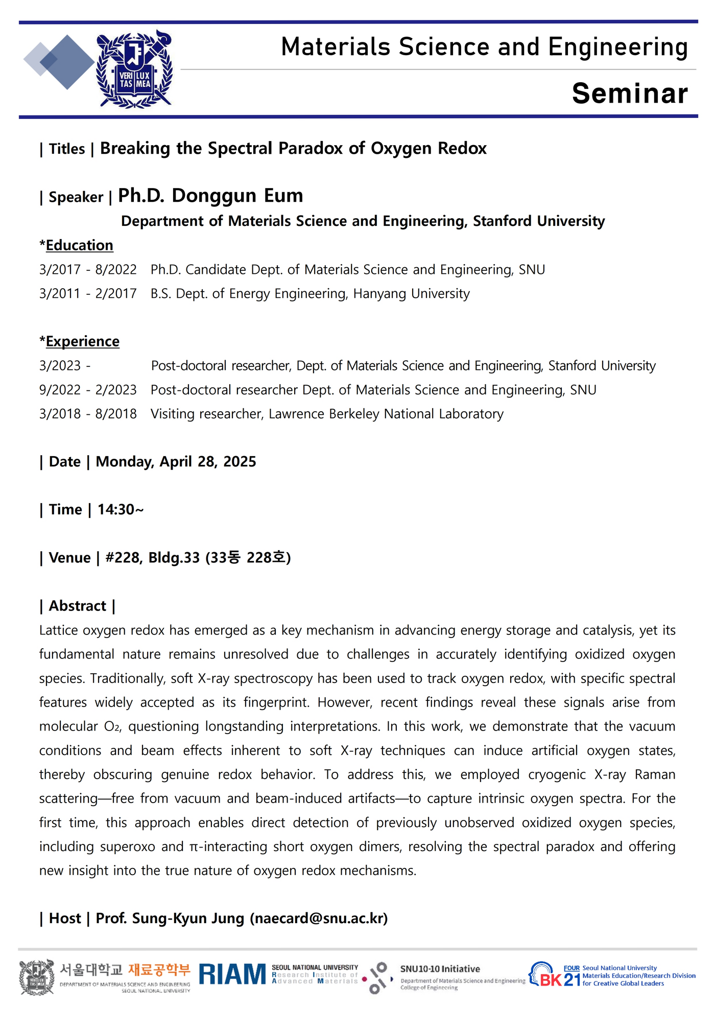 [세미나: 4월 28일(월), 오후 2시 30분] Ph.D. Donggun Eum, Dept. of Materials Science and Engineering, Stanford Univ.