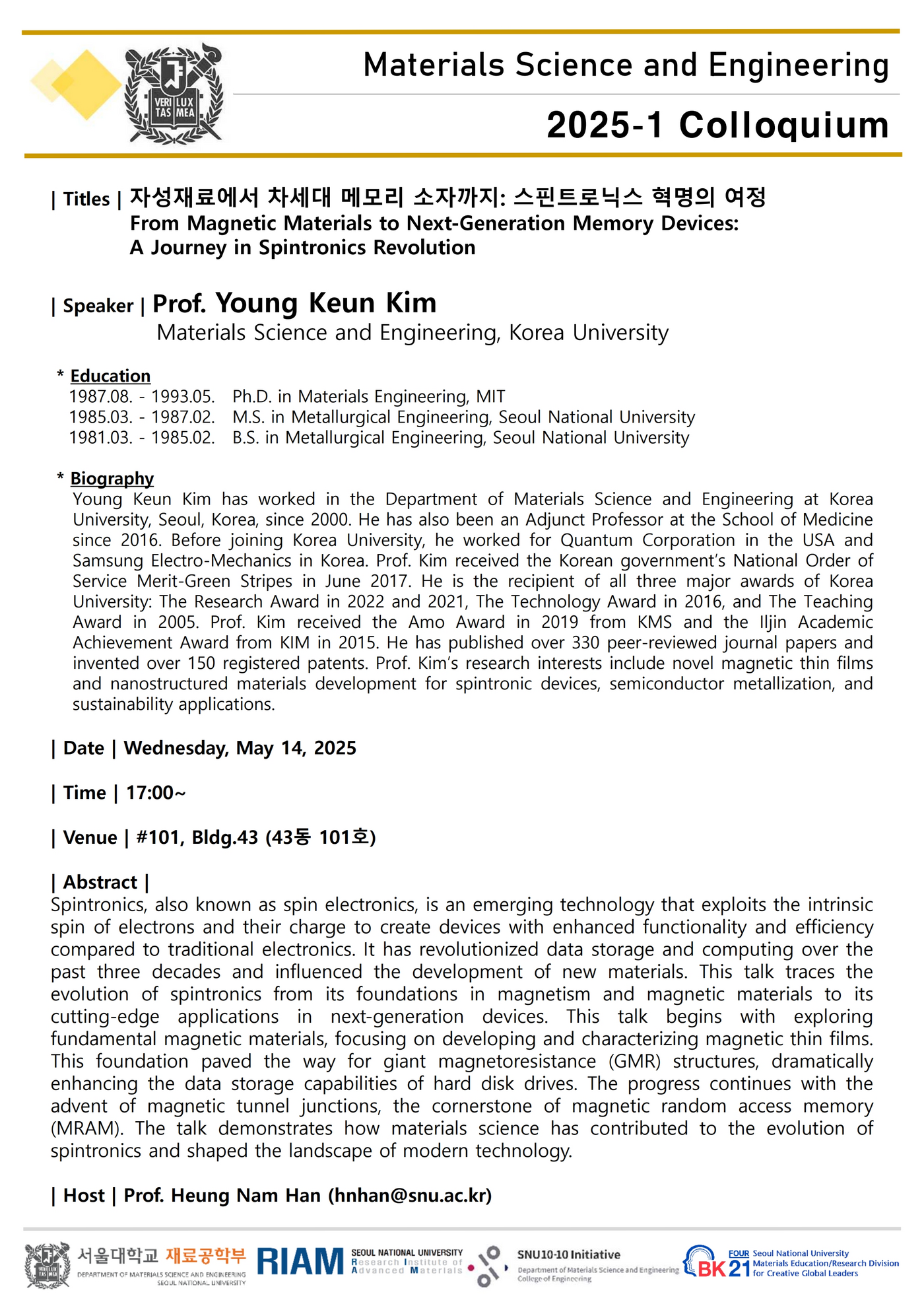 [콜로퀴엄: 5월 14일(수), 오후 5시] 김영근 교수, 고려대학교 신소재공학부