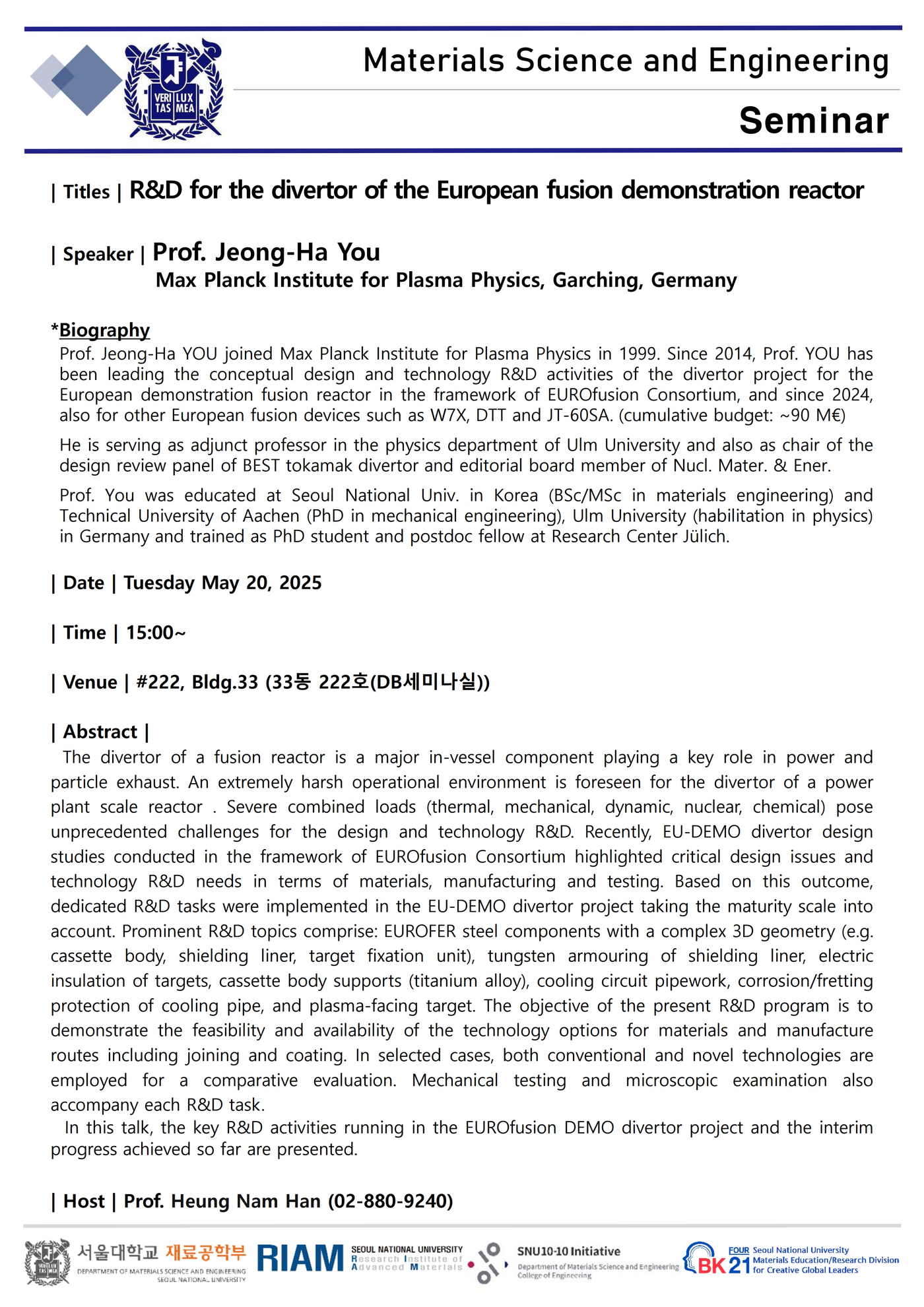 [세미나: 5월 20일(화), 오후 3시] Prof. Jeong-Ha You, Max Planck Institute for Plasma Physics, Germany