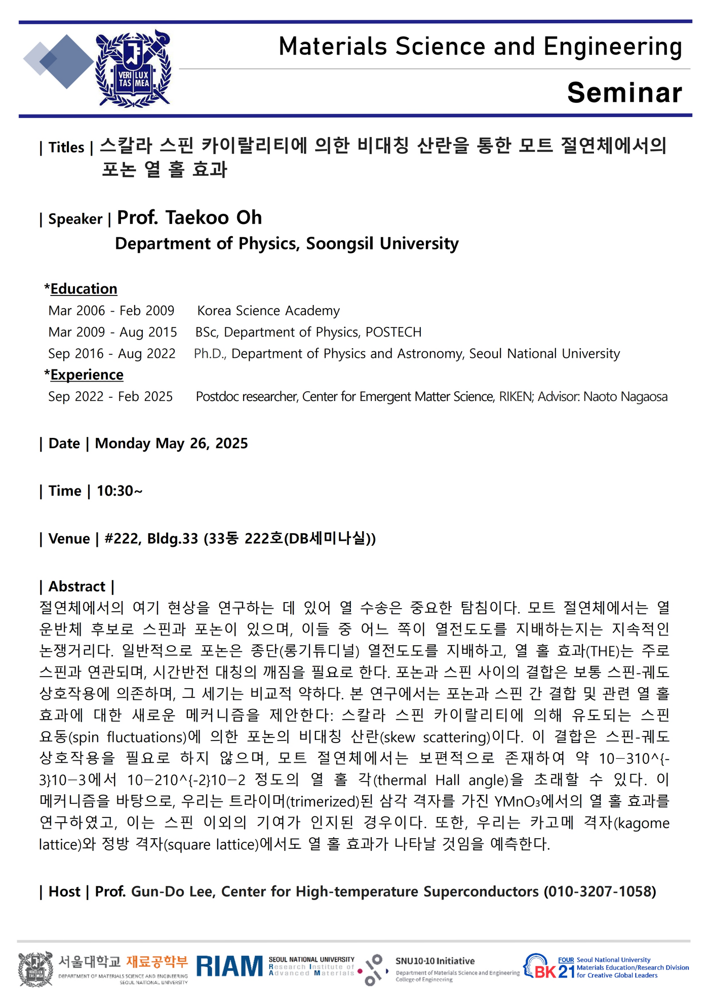 | Titles | 스칼라 스핀 카이랄리티에 의한 비대칭 산란을 통한 모트 절연체에서의 포논 열 홀 효과