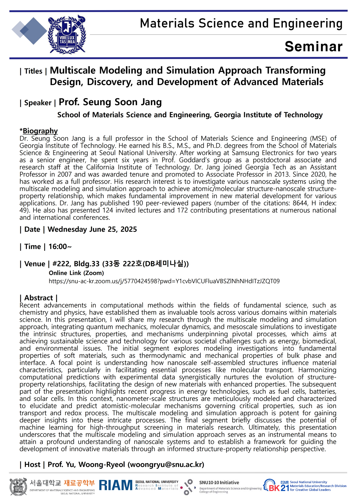 [세미나: 6월 25일(수), 오후 4시] Prof. Seung Soon Jang, School of Materials Science and Engineering, Georgia Institute of Technology