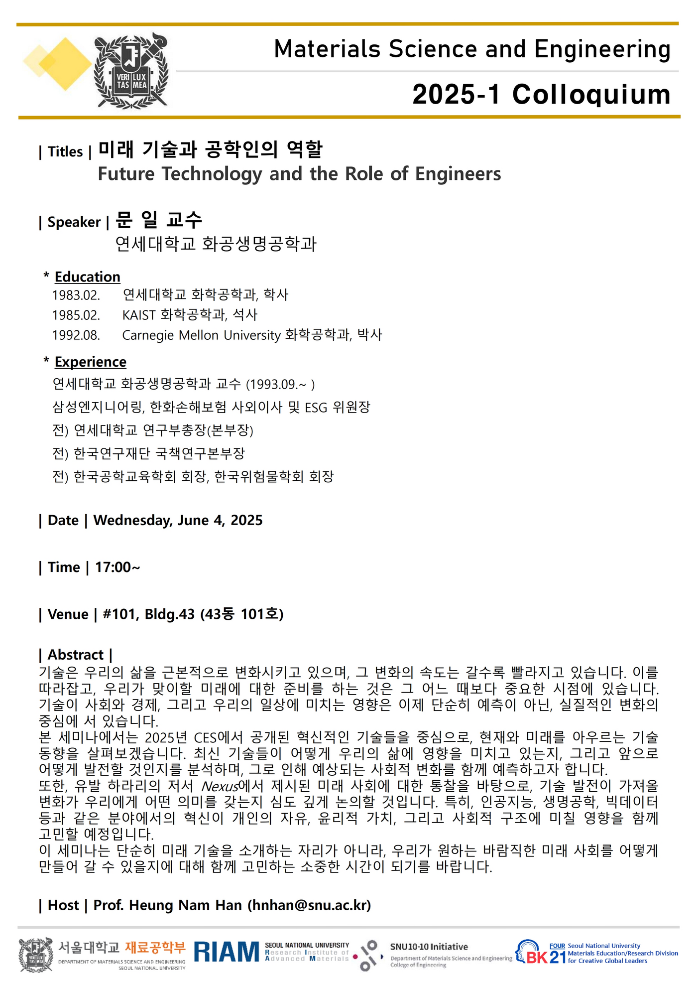 [콜로퀴엄: 6월 4일(수), 오후 5시] 문일 교수, 연세대학교 화공생명공학과