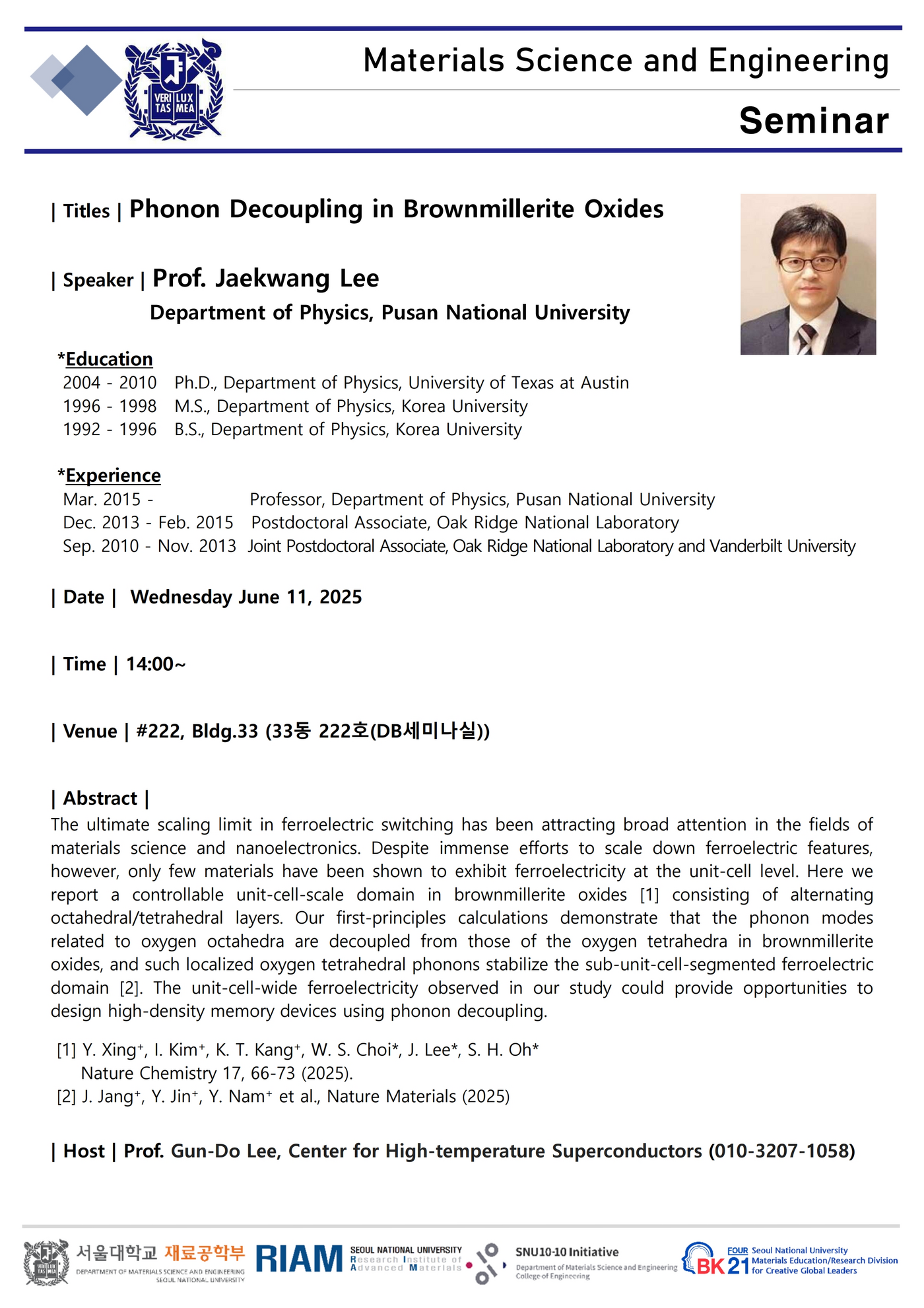 [세미나: 6월 11일(수), 오후 2시] Prof. Jaekwang Lee (Department of Physics, Pusan National University)