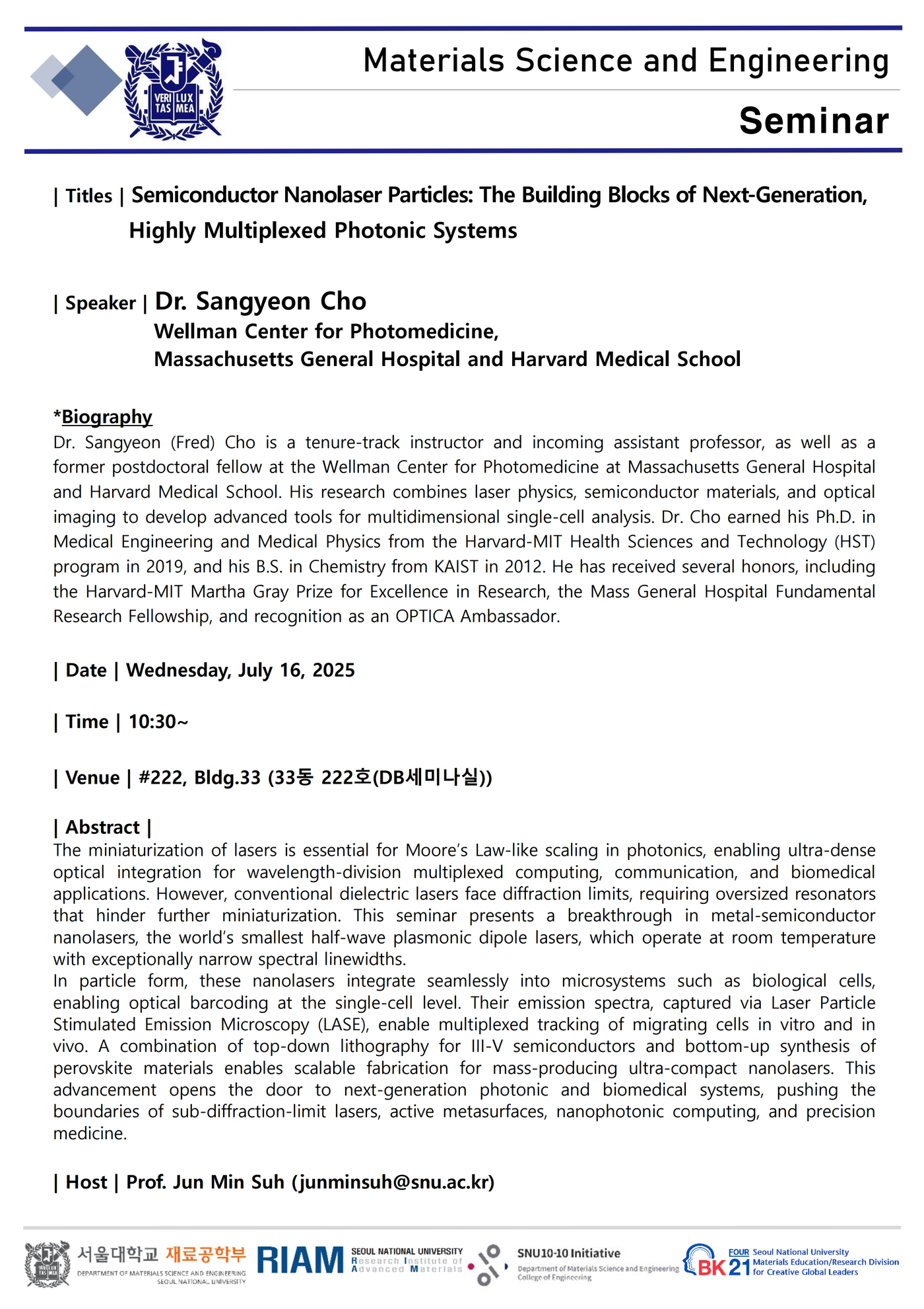[세미나: 7월 16일(수), 오전 10시 30분] Dr. Sangyeon Cho (Wellman Center for Photomedicine, Massachusetts General Hospital and Harvard Medical School)